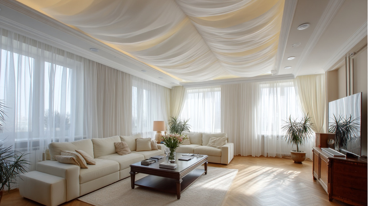 Сатиновые натяжные потолки универсальны и могут эффективно применяться в различных типах помещений, от жилых комнат до офисных пространств. Рассмотрим, какие преимущества они предоставляют для разных видов интерьеров.