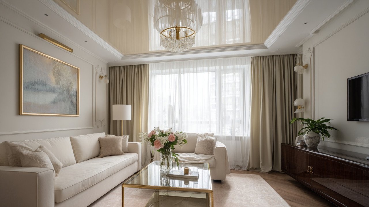Одно из главных преимуществ сатиновых потолков – их способность визуально увеличивать помещение. Мягко отражая свет, они создают иллюзию более высоких потолков и просторной комнаты. Этот эффект особенно ценен в небольших помещениях или комнатах с низкими потолками, где каждый сантиметр на счету.